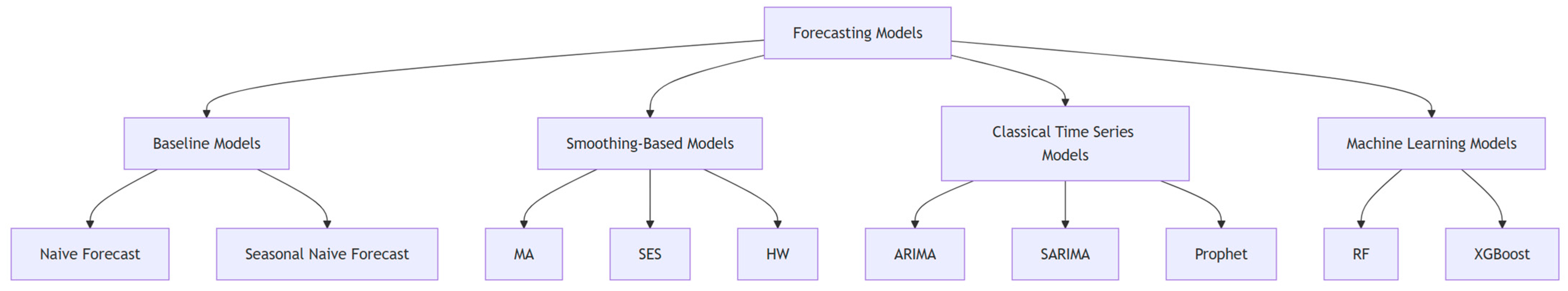 To reflect varying data availability and technical maturity in SMEs, the benchmark includes a broad set of forecasting models—ranging from simple statistical to advanced machine learning methods—grouped into four categories: baseline (Naive and Seasonal Naive), smoothing-based (Moving Average (MA), Seasonal Exponential Smoothing (SES), and Holt–Winters (HW)), classical time series (ARIMA, SARIMA, and Prophet), and machine learning (Random Forest and XGBoost).