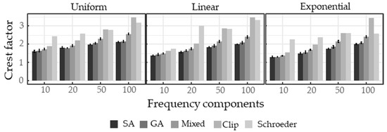 According to the intended application scenarios, different parameters were selected for a detailed investigation. Three amplitude distributions—uniform, linear, and exponential (the latter two decreasing with increasing frequency)—were of importance for our research. The upper bandwidth was limited to 106 Hz as this was a reasonable tradeoff between CF reduction and calculation effort. The frequency distribution was fixed as was the number of iterations.