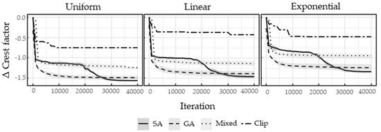 The results show that the final CF for Clip and Schroeder was surpassed by all presented algorithms after only a few iterations. The results using Schroeder’s formula were similar to the final CF of the Clip algorithm (see Figure 1 for comparison). The high reduction lasted until iteration 10,000, before slowing down. SA was the exception because it depended on the predefined annealing schedule. Therefore, the characteristic curve was always the same regardless of the number of iterations. Nevertheless, the curve of SA showed that the start phase of the algorithm was purely random, and the last phase seemed very long. This is an indication that a more diligent hyperparameter search could accelerate the algorithm.
