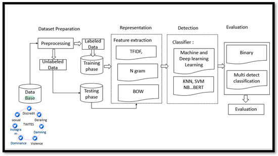 In 2020, Aggression and Misogyny Detection using BERT was proposed for three languages, such as English, Hindi, and Bengali [6]. The proposed model used an attention mechanism over BERT to get the relative importance of words, followed by fully connected layers and a final classification layer, which predicted the corresponding class [6]. The misogyny identification techniques offered satisfactory results, but the recognition of aggressiveness is still in its infancy for some languages [7]. Misogyny detection in the Arabic language is still in its early stages, with only a few important contributions existing [8]. In the last five years, there has been a growth in the number of researchers who are interested in automatic Arabic hate speech detection in social media. In the presented research, Arabic text detection based on Misogyny has been extensively studied. This study starts with a comparative study of the neural network and transformer-based language models that have been applied for Arabic fake news detection [9]. In terms of generalization, AraBERT v02 outperformed all other models evaluated. They advised using a gold-standard dataset annotated by humans in the future, rather than a machine-generated dataset, which may be less reliable [9]. In the same domain of detection, the word2vec model was suggested to detect semantic similarity between words in Arabic, which could assist in the detection of plagiarism. The authors built the word2vec model using the OSAC corpus [10]. Here, the authors focused on creating a successful offensive tweet identification dataset. They quickly constructed a training set from a seed list of offensive words. Given an autonomously generated dataset, they represented a character n-gram and used a deep learning classifier to achieve a 90% F1 score [11]. A single learner machine learning approach and ensemble machine learning approach was investigated for offensive language detection in the Arabic language [12]. In addition to this, a transfer learning method and AraBERT were used for Arabic offensive detection datasets. The results reported an outperformance of Arabic monolingual BERT models over BERT multilingual models. Their results mentioned that there was a limitation by the effects of transfer learning on the performance of the classifiers, particularly for the highly dialectic [13]. With the augmentation of the data to improve text detection, the authors experimented with seven BERT-Based models, and they augmented a task dataset to identify the sentiment of a tweet or detect if a tweet was sarcasm [14]. Their experiments were based on fine-tuning seven BERT-based models with data augmentation to solve the imbalanced data problem. For both tasks, the MARBERT BERT-based model with data augmentation outperformed other models with an increase of the F-score by 15%. Regarding the influence of preprocessing in text detection, a simple but intuitive detection system based on the investigation of a number of preprocessing steps and their combinations was addressed [15]. Here, a comparison between LSVC and BiLSTM classifiers was conducted. The detection of misogyny in Arabic text was presented using the Arabic Levantine Twitter dataset for Misogynistic language (LeT-Mi), which was the first benchmark dataset for Arabic misogyny. They employed an MTL configuration to investigate its effect on the tasks. They presented an experimental evaluation of several machine learning systems, including SOTA systems. The result for accuracy was equal to 88 and presented an approach based on stylistic and specific topic information for the detection of misogyny, exploring several aspects of misogynistic Spanish and English user-generated texts on the Twitter Section (Heading 1) [16]. Finally, an approach based on character level for Arabic text utilizing convolutional neural network (CNN) has been presented to solve many problems, such as difficulties in preprocessing, etc. [17].