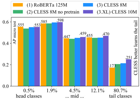 Long-tail performance (RQ-1, RQ-2), over all five head to tail class bins—see Figure 2. The tail class bin contains 80.7% or 1062/1315 of classes. The non-pretrained CLESS (2) underperforms, while RoBERTa performs the worst on the of tail classes. The largest pretrained CLESS model (3.XL) outperforms RoBERTa in tail and mid class prediction, while performing nearly on par for the (most common) head classes.