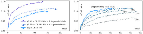 In Section 4, we study how CLESSs’ zero-shot long-tail retention ability is impacted by: (left) using more pseudo labels (learning signal) during pretraining; and (right) by using only portions of unlabeled text data for pretraining. To do so, we pretrain CLESS variants on pseudo labels and evaluate each variant’s zero-shot performance over all 1315 classes of the real-label test set from Section 4. As before, we show test score curves for the models with the best dev set performance.