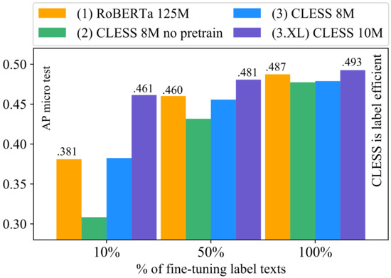 In Figure 5, we see that when using full supervision (100%), all models perform similarly, with CLESS (3.XL) slightly outperforming RoBERTa (0.493 vs. 0.487) . For few-shot learning (10%, 50%), we see that CLESS 3.XL retrains of its original performance when using only 10% of fine-tuning labels, while RoBERTa and CLESS 8M each retain around 77%. This demonstrates that even a sightly larger contrastive pretraining model, with increased self-supervision signal (3.XL), not only improves zero-shot learning performance as was seen in Figure 4, but also markedly boosts few-shot performance. Noticeably, the only non-pretrained model (2), performs much worse than the others in the more restricted few-shot scenarios. Since models (2) and (3) use the same hyperparameters and only differ in being pretrained (3) or not being pretrained (2), this demonstrates that contrastive self-supervised pretraining largely improves label efficient learning.
