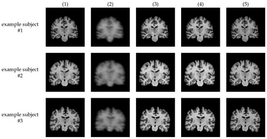 As the high-resolution reference images, we used 37 scans of T1-weighted MR images from the DS000113 (“Forrest Gump”) dataset [] and 11 images from the DS002702 dataset [], both published by OpenNeuro (https://openneuro.org/, accessed on 20 September 2020). Both datasets are provided as a collection of functional-MRI (fMRI) images but also contain T1-weighted still MR images we used, which were taken on a high-field 7T scanners. After the skull removal and intensity normalization, each HR image is shrunken to 50% to make an LR image, providing high- and low-resolution training pairs. At the SPS phase during the training, we randomly sampled 2500  patches per one high-resolution image and downsampled them to 50% resolution to make low-resolution images.
