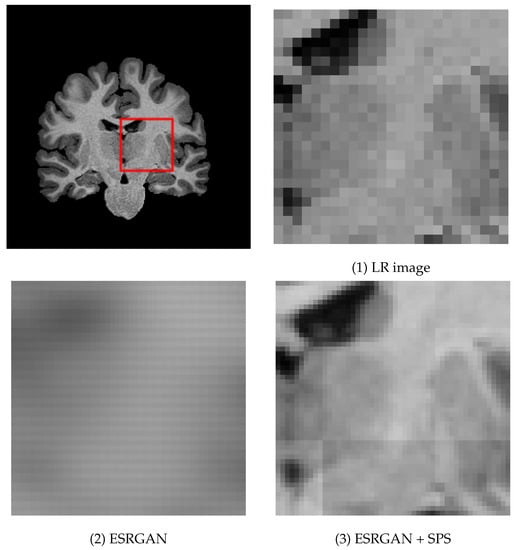 Along with the advancement of super-resolution methods for general images, studies for applying SR for medical images have also been made. Pham et al. [] applied SRCNN to MR images to enhance spatial resolution. The improvement with GAN-based techniques has also been applied to medical imaging fields []. Sánchez and Vilaplana [] utilized a simplified version of SRGAN to MR images. Yamashita and Markov [] improved the quality of optical coherence tomography (OCT) images with ESRGAN.