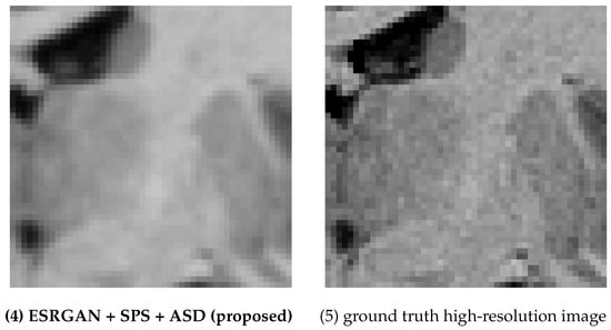 Examples of generated images with their input and ground-truth images. (1) low-resolution input image, (2) ESRGAN without SPS and ASD, (3) ESRGAN + SPS, (4) ESRGAN + SPS + ASD (proposed), and (5) ground truth high-resolution image.
