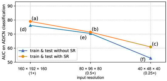 In this experiment, we used 650 images from the ADNI2. (Data used in the preparation of this article were obtained from the Alzheimer’s Disease Neuroimaging Initiative (ADNI) database (adni.loni.usc.edu). The ADNI was launched in 2003 as a public-private partnership, led by Principal Investigator Michael W. Weiner, MD. The primary goal of ADNI has been to test whether serial magnetic resonance imaging (MRI), positron emission tomography (PET), other biological markers, and clinical and neuropsychological assessment can be combined to measure the progression of mild cognitive impairment (MCI) and early Alzheimer’s disease (AD). For up-to-date information, see www.adni-info.org, accessed on 20 September 2020) dataset, containing 360 cognitively normal (CN) images and 290 Alzheimer’s disease (AD) images. Each image is downsampled into 1.4-mm pixel spacing to match the training data after skull removal and intensity normalization. We first performed super-resolution for all images to make pseudo-high-resolution training/validation samples. Then, we trained a three-dimensional version of MobileNetV2 with 90% of the images and evaluated the area-under-curve (AUC) score with the remaining 10% of them.