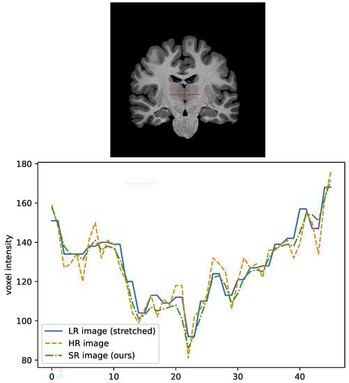 First, we measure the two most standard metrics for assessing a super-resolution system: (1) peak signal-to-noise ratio (PSNR) and (2) structural similarity (SSIM) between each output image and its corresponding original high-resolution image. In general, SR studies using GAN, Inception Score, and Fréchet Inception Distance (FID) are often used. However, scores are calculated based on low-dimensional representations of two-dimensional images by models trained on everyday objects (e.g., ImageNet) and are unsuitable for this evaluation. We also investigate the line profile of the optic thalamus, which is difficult to see for fine structure with a conventional MR scanner.