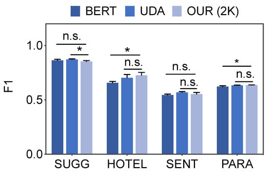 Comparison between BERT and UDA, with our method. BERT and UDA are trained with full training examples, and our method was trained with only 2000 examples. Training datasets were SUGG, HOTEL, SENT, and PARA. Data are presented as . Significance: not significant (n.s.) , * .
