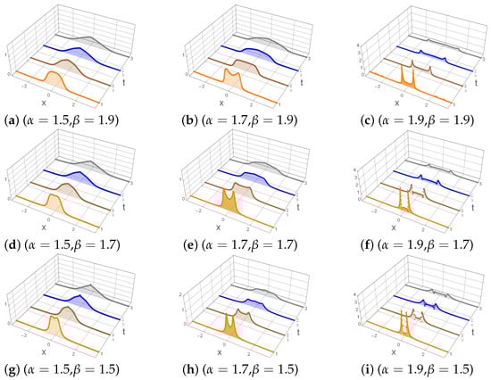 In Figure 1, the graphic representation of the solution is depicted in Equations (11) and (12) for some combinations of . According to the graphics contained in the panel, the solution to Equation (3) can be studied in terms of a disturbance propagating in a vibrating medium. In all the cases presented herein, a mixture of diffusive and wave-like behavior can be observed in the traveling disturbances. As becomes smaller, the diffusive behavior becomes more predominant. As approaches 2, the wave-like behavior is predominant over the diffusive one and the effects of the reduction in the parameter become notorious, as can be observed in the third column with the change in the shape in the center of the traveling disturbances, in contrast to the first and second columns where such changes are not evident. Such a phenomenon may be associated with the presence of jump processes (as can be seen in [,,]) into the traveling disturbance; as is reduced, its effects become more significant.