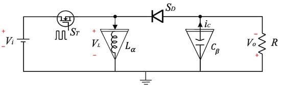 The literature is prolific in studying integer-order models of DC–DC converters. Nevertheless, the capacitor and inductor could behave depending on fractional derivatives [1,6]. Therefore, fractional order models provide a more accurate description and deeper insight into physical processes [7,8]. In recent years, there has been significant study and development of fractional order systems [9,10]. Unfortunately, the inconsistency of units at the time of modeling is often overlooked when trying to model these electronic elements. There are three most used definitions of fractional calculus: Caputo Derivative (CD), Riemann–Liouville (R-L) fractional integral, and Grünwald–Letnikov (G-L) derivative [11]. Because of differences between the fractional calculus definitions, the model results under different fractional orders may present variations related to the used fractional derivative and the occasional requirement of initial conditions.