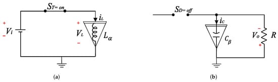 In this circuit, R [] corresponds to the load, [V] stands for the input voltage, represents an ideal switching power MOSFET, and an ideal diode. In a broad sense, the converter works as follows: when it operates in CCM, it appears in two switching states defined below.
