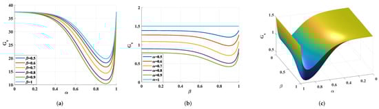Figure 4 displays the response of the Buck-Boost converter fractional model in the stable state. Plus, in Figure 4b, we fixed , varying the value of . Notice that the response falls slowly but then recovers rapidly. Figure 4a is the opposite case. When varying , the response tends to mimic the behavior shown in Figure 4b. Additionally, Figure 4c shows the dynamic variation of the with the change of the fractional order, presenting a minimum gain when .