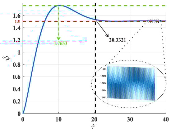 Figure 6b shows the nondimensionalized capacitor voltage under different scenarios. We noticed that when the fractional order tends to unity, we obtain the traditional responses of the converter, containing a myriad of oscillations. Further, the converter must evolve for a long time to reach the desired reference. However, when begins to decrease, this reference is tracked in a shorter time. A similar behavior occurs with the nondimensional inductor’s current for the nondimensional voltage when , as Figure 7 shows. The obtained output is the desired one in this type of converter: a smooth and controlled voltage rise, a lower overshoot concerning the other solutions, and a fast settling time.