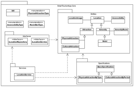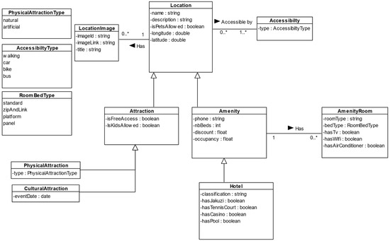 The PIM of the system is a subset of the domain model that manages the attractions and amenities of tourist destinations in a region. It contains nine classes and three enumerations, as shown in Figure 1. We find the Accessibility, Amenity, AmenityRoom, Attraction, Hotel, Location, LocationImage, PhysicalAttraction, and CulturalAttraction classes and the PhysicalAttractionType, AccessibilityType, and RoomBedType enumerations. The Location base class represents a geographic location that may interest a visitor and is accessible by foot, car, bike, and/or bus. A location can be an attraction site that tourists can visit during their trip or an amenity such as hotels where they can stay during their vacation.