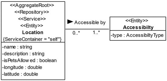 PIM parameterization of the Location and Accessibility classes. UML standard: “*” indicates the “many” multiplicity in an association. “Triangle” indicates the di-rection of the association.