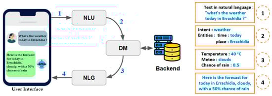 The architecture of an agent usually consists of three essential components [10,11]. The first one is the NLU component, which receives NL text from the user interface (label 1 in Figure 1) and extracts intents and entities (label 2). This representation is then handled by the Dialogue Manager (DM), which examines the context of the conversation and can perform different actions depending on the intent, such as calling an external service to retrieve data (label 3). Finally, a natural language generation (NLG) component produces a response, typically an NL sentence (label 4).