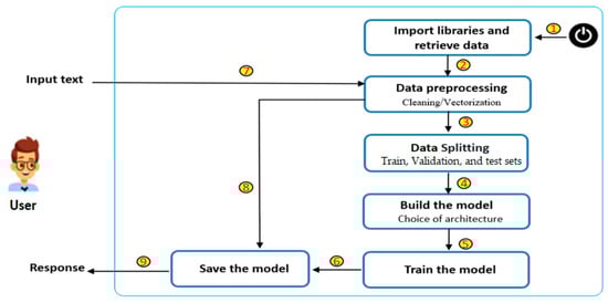 Our approach in this study consists of five steps. First, we import data we want to use (label 1 in Figure 3). In the second step, we preprocess data (label 2). In the third step, data are divided into two sets, one for training and the other for testing the model (label3). In the fourth step, a Seq2Seq model is built using encoder–decoder architecture, with LSTM cells for both components (label 4). An encoder is used to understand the user’s message, while a decoder is used to generate a response. Finally, the model is trained and saved (label 6) and used to converse with users (labels 7, 8, and 9).