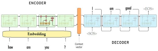 Keras [18] and TensorFlow [19] are open-source software libraries for building and training deep learning models, which are used for building Seq2Seq models using encoder–decoder architecture with LSTM cells. Keras is a high-level neural network API written in Python and runs on top of TensorFlow. It provides a set of pre-built layers, including LSTM layers. Figure 4 shows the architecture of our model that we built using these APIs. It consists of an encoder and a decoder, usually RNNs such as LSTMs, which we used in our experiment. The encoder takes an input sequence, such as an English sentence, and converts it into a context vector representing the information in the input sequence. A decoder uses this context vector to generate an output sequence, such as a response to a user’s message.