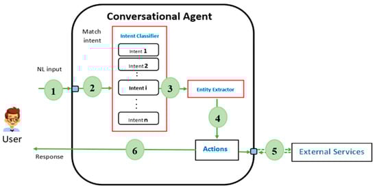 Figure 1 shows a simplified diagram of how a CA works [4,5]. A standard method of CA design is based on the use of “intents”, which essentially correspond to the objectives or goals that the user wishes to achieve when they are initiating a conversation with the CA.