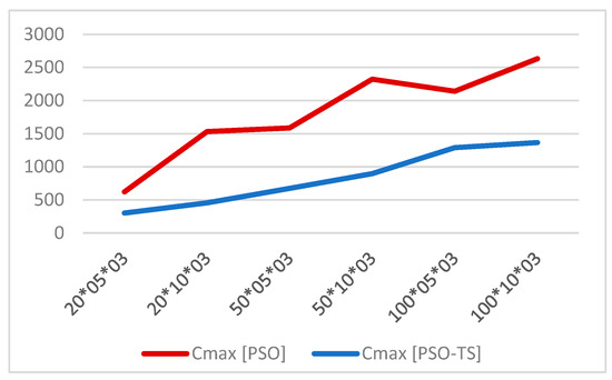We note that the proposed PSO–TS method is more efficient regarding the makespan value for different sizes of instances. Still, it takes longer to be executed compared to PSO alone.