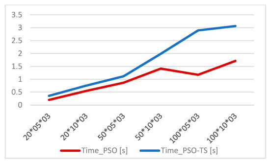 As seen in Figure 1, the resulting curves show that PSO–TS hybridization excels over PSO. Additionally, as seen in Figure 2, the computation time that the PSO–TS algorithm takes to be executed is higher than that of the PSO.
