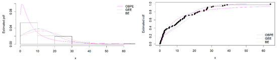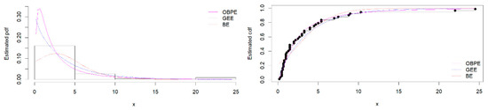 The maximum likelihood estimates (MLEs), standard errors (SEs), , AIC, BIC, CM, and AD statistics for the OBPE, GEE, and BE are presented in Table 1. From the results in Table 1, it is clear that the OBPE distribution provides a better fit for the data, having smallest values of , AIC, BIC, CM, and AD, and could be selected as a more appropriate model than other models. Figure 1 depicts the estimated pdfs and cdfs of the fitted distributions. It is clear from these plots that the OBPE describes the data in a more appropriate way than other competing models.