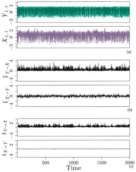 Results for the unidirectionally coupled stochastic Hénon map. (a) Y and X time series, (b) local transfer entropy, (c) specific transfer entropy Reprinted with permission from [14].