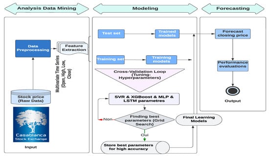 The 2008 recession, the stock market crash of 2015, the COVID-19 Pandemic, and the Russian Invasion of Ukraine are some of the most recent crises which have had an immense impact on the financial markets and the destruction of wealth worldwide. Modeling and forecasting the stock market is a challenge that many engineers and financial researchers face. The literature review examined studies on stock market prediction using Machine Learning (ML) models. It concluded that Deep Learning (DL) was the most commonly utilized model for forecasting stock price trends [1,2]. Traditional econometric methods might require improved performance in relevant nonlinear time series and may not be appropriate for directly forecasting stock prices because of their volatility [3]. However, for complex nonlinear financial time series, methods such as Support Vector Regression (SVR), eXtreme Gradient Boosting (XGBoost), Multilayer Perceptron (MLP), and Long Short-Term Memory (LSTM) can detect nonlinear relationships in the forecasting of stock prices [4] and achieve better fitting results by tuning multiple parameters [5]. Hyperparameter optimization or tuning in ML refers to selecting the most appropriate parameters for a particular learning model [6]. Some studies use Grid Search (GS) optimization [7], while others use Bayesian [8,9] or pigeon-inspired optimization algorithms [10]. In this paper, the GS algorithm is used to optimize the parameters of each model, such as SVR, XGBoost, MLP, and LSTM models. Then, we compare them using seven measures: Mean Error (ME), Mean Percentage Error (MPE), Mean Square Error (MSE), Mean Absolute Error (MAE), Root Mean Square Error (RMSE), Mean Absolute Percentage Error (MAPE), and R. In [11], it was discovered that using LSTM with Moving Averages (MA) yields superior results for predicting stock prices compared to SVR, as measured by different performance criteria such as MAE, MSE, MAPE, RMSE, and R values. In their research [12], Al-Nefaie et al. proposed using LSTM and MLP models to forecast the fluctuations in the Saudi stock market. They found that the correlation coefficient for the two models was higher than 0.995. The LSTM model proved to have the highest accuracy and best model fit. In [13], the authors compared performance measures such as MSE, MAE, RMSE, and MAPE to forecast stock market trends based on Auto-Regressive Integrated Moving Average (ARIMA), XGBoost, and LSTM. Their tests found that XGBoost performed the best. In a different context, ML methods such as ANN and MLP [14] were used to forecast solar irradiance. The results indicate that the MLP model with exogenous variables performs better than the other models. Similarly, in another study [15], the predictive performance and stability of eXtreme Gradient Boosting Deep Neural Networks (XGBF-DNN) made it an optimal and reliable model for forecasting hourly global horizontal irradiance using the GS algorithm. The main objective of this investigation is to improve the GS optimization algorithm by optimizing the hyperparameters of ML models. Furthermore, this study compares two ML methods and two DL methods. To achieve this objective, the research includes an in-depth literature review of 20 studies on ML models for stock market prediction. Overall, the paper aims to contribute to the stock market prediction field by improving the performance of ML models through hyperparameter optimization. Our contribution is highlighted in Table 1, which offers a more accurate prediction than other studies.