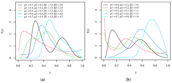 where = , , = (, , and are location parameters associated with the th quantiles of each component of the mixture, and are shape parameters, and is assumed to be known. One can note we use a parameterization based on quantiles to formulate each component of the mixture. The advantage of working with reparametrization in terms of quantiles is its flexibility to model data with heterogeneous conditional distributions [16,17]. The probability density function (pdf) is given by