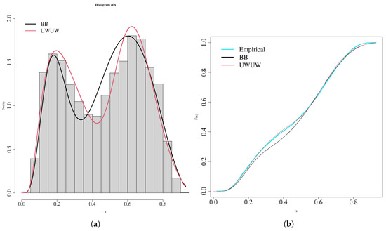 In what follows, we present a case study that illustrates the suitability of the distribution for modeling real unit data sets. The database considered is the municipality’s vote proportion of the winning candidate in the Brazilian presidential elections runoff in 2018. Since it presents a bimodal shape, see Figure 2a, a unimodal distribution would not be appropriate to fit this data set. Therefore, the distribution is a suitable alternative to model these data. Its performance is compared with other double-bounded component mixtures that have already been studied in the literature: two-component beta mixture () model. In this paper, the parameterization proposed by [19] is considered to define the model, which has pdf given by