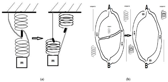 Before coming to more complex topologies and non-classical physical contexts where Braess’s paradox occurs, let us stay with the Wheatstone network setup. There exists a mechanical analogy for Braess’s paradox in exactly this setup: Initially, two springs with the same spring constant are coupled by an inelastic string (bold black in Figure 2a), thereby carrying the mass m in series (Figure 2a left). Two inelastic strings of equal length connect each spring to the ceiling, corresponding to the mass m, and are limp (grey in Figure 2a). When the strings are taut and the connection between strings is cut, a seemingly paradoxical behavior lets the springs contract and lift the mass m a bit (Figure 2a, right). But the apparent paradox is easily solved: In the new equilibrium state, the two inelastic strings share the mass m in a parallel setup [7,12]. To observe this inverse of Braess’s paradox—the reduction of force acting on each of the springs after removing an unfortunate coupling—the contracted springs reduction in length must exceed the extended strings additional length.