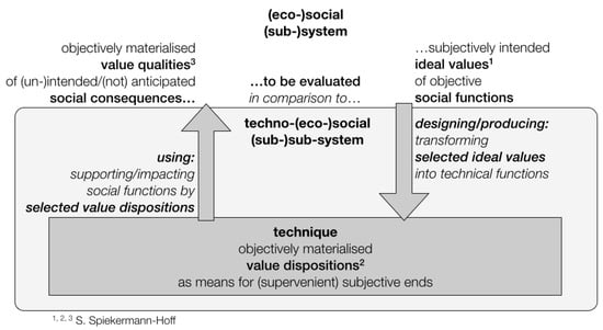 We start from ideal values that are implied by objective social functions and intended subjectively. This starting point is on the side of the social system at the border with the techno-social system. The border is crossed when ideal values have been selected to be transformed into technical functions. This transformation is the process of design/production of technology. It takes place within the techno-social system. It reaches its end point when selected ideal values have been materialised in value dispositions of technical functions. This materialisation is objective. It is located in the technology, the technical part of the techno-social system. As technology is a means for subjective ends, it is the starting point of another process back to the social system. The process starts when value dispositions have been selected to support/impact on social functions. This process is also a transformation process. It is the process of usage. It also performs within the techno-social system. It ends when selected value dispositions have been materialised in value qualities of social consequences beyond the border to the social system. These social consequences are objective consequences in the social system. They might be intended or unintended, and might have been anticipated or not.