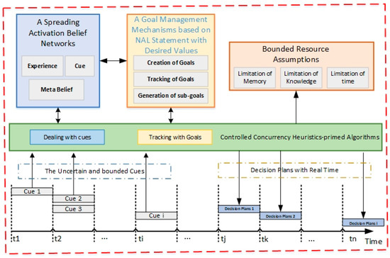 As the intelligent agent accumulates more cues from the environment over time, the architecture activates the relevant cue-related network, continuously adjusts the desire value of the goal, and re-determines the context of the decision. In a working cycle, the intelligent agent will infer a “rational” decision plan that is adapted to the situation.