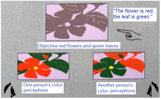 As early as 1988, the author [17] introduced in Chinese the debate about the Inverted Spectrum and referred to it as Inverted Color Sensations (ICS). The method to prove the logical probability of ICS [9,10] is to assume that two children naturally have two opposite color sensations for red flowers and green grass. When teaching the two children color names, adults can only point to the red flowers and green grass rather than one’s color sensations. Therefore, the children can only unconditionally accept these assignments, despite differences between their color sensations (Figure 2).