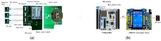 This section introduces the hardware setup for the proposed data collection and analysis. It discusses the hardware used for temperature and sound collection, information analysis, and data storage. The hardware is divided into two parts: the data collection terminal and the data analysis and storage terminal. Concerning the data collection, Figure 1a shows the hardware details of the data collection terminal. Three TMP117 temperature sensors are located in the nose tip, nostrils, and mouth. In addition, the sound is acquired using an MP34DT05−A sound sensor. The collected information is transmitted to the STM32WB55RG main control chip via FPC connectors. Concerning the data transmission to the analysis/storage terminal, which is responsible for displaying the data on the screen, executing the data analysis algorithm, and storing the data on the memory card. More hardware details of the analysis/storage terminal are shown in Figure 1b.