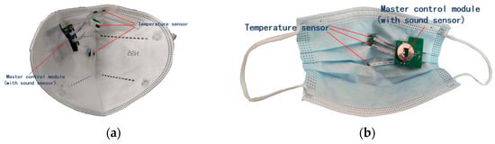This section presents the integration of the data collection terminal into a face mask. Figure 2 displays installment results for KN95 and surgical masks. The temperature sensors are positioned near the nose, inside the nostril, and near the oral cavity to ensure accurate data collection. The mask simultaneously collects temperature and sound data and transmits it, along with time information, to the analysis and storage terminal at a 1-s frequency. In addition, human axillary temperature and ambient temperature were measured using an electronic thermometer and the TMP117EVM GUI, respectively.