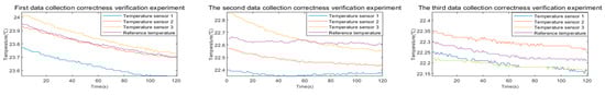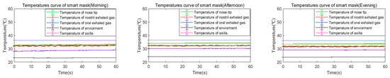 To evaluate the accuracy of the collected temperatures, the TMP117EVM GUI is simultaneously used to measure the ambient temperature as a reference. Figure 3 displays three iterations of temperature collection with a total duration of 120 s. Results show a maximum deviation of 0.2 degrees Celsius. Considering the TMP117′s accuracy of ±0.1 degrees Celsius, the body temperature data collected using our proposed mask is considered accurate. Figure 4 shows the collected temperature in the morning, noon, and evening.