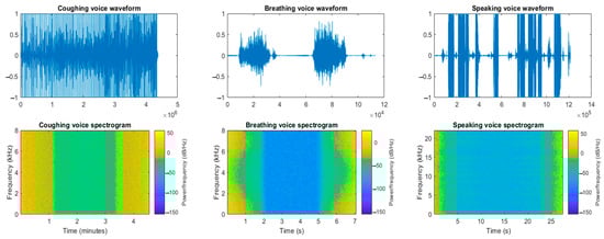 The remarkable progress in medical technology has allowed doctors to provide better diagnoses and treatments. Nowadays, Artificial Intelligence (AI) is used in medical research to classify and predict diseases. As a main element in AI, the more data collected, the more efficient the system. Several scholars worked on the modeling of human body temperature. Mondaet al. proposed a low−cost, lightweight remote temperature monitoring solution with 98% accuracy [1]. AirPoP Co. developed a sensor array−integrated mask for detecting breathing parameters [2]. The human thermal database developed by JSC collected relevant data from literature and experiments on human subjects from 1953 to 2004 [3]. Concerning sound databases, it has been researched for urban noise monitoring systems in large cities, environmental sound classification for bird migration research, and sound event detection for emergency sound in construction sites [4,5,6]. However, these datasets are not suitable for medical use.