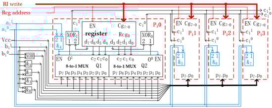 For CET, the most important part in the RQLO typical structure is the reconfiguration registers Rcg0, Rcg1, Rcg2, and Rcg3 (note that only Rcg0 is drawn in Figure 1), and the values written in these four registers determine the logic operation function of the typical structure. Rcg0, Rcg1, Rcg2, and Rcg3 are combined into a 32-bit register RGi. RGi is called the ith reconfiguration register, and the RI written to RGi is called the ith RI. Thus, the 32-quit RQLO typical structure has 32 RGi (i = 0, 1, …, 31), which are collectively called the reconfiguration register RG of the typical structure. RG has 1024 bits, and the corresponding RI for the 32-quit RQLO typical structure has 128 bytes.