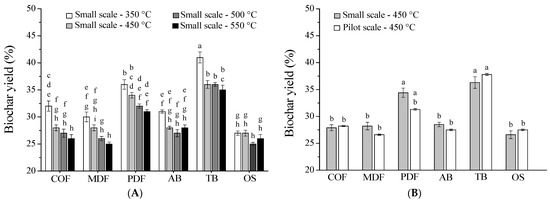 Biochar yield in function of the pyrolysis temperature (A), and comparison between lab-scale and pilot-scale reactor (T = 450 °C) (B) [30]. Means with different letters indicate a statistically significant difference (Tukey’s HSD, p < 0.05). COF = coffee husks, MDF = medium-density fiberboard, PDF = palm date fronds, AB = AB wood waste, TB = tree bark, and OS = olive stones. The lowercase letters above the columns are presented to compare different columns to each other. Columns with the same letter are not statistically different from each other, while columns with differing letters are statistically different from each other.