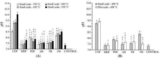 Influence of pyrolysis temperature (A) and upscaling (B) on the pH of biochar submerged in “Organization for Economic Cooperation and Development” (OECD) standard water. Means with different letters indicate statistically significant difference (Tukey’s HSD, p < 0.05). COF = coffee husks, MDF = medium-density fiberboard, PDF = palm date fronds, AB = AB wood waste, TB = tree bark, OS = olive stones, and control = OECD standard water. The lowercase letters above the columns are presented to compare different columns to each other. Columns with the same letter are not statistically different from each other, while columns with differing letters are statistically different from each other.