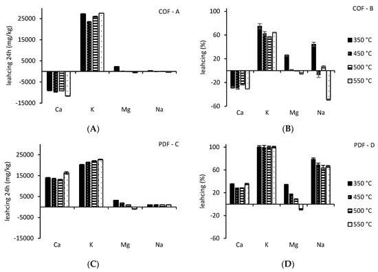 The results of the leaching experiments (Figure 3) could also explain the difference in EC between COF and PDF as their ash content was similar. Compared to COF biochar, PDF leached out more inorganic elements after 24 h (Figure 3), explaining its higher EC. However, the difference in EC could also be the result of more Cl leaching: 31.8 g/kg at 450 °C, over 24 h in ultrapure water for PDF biochar compared to 0.6 g/kg for COF biochar. The general increase in EC with rising pyrolysis temperature is in line with the increase in ash content (Table 3). Even though for most analyzed elements, the percentage leached decreased with pyrolysis temperature (Figure 3B,D), the total amount of leached elements increased with pyrolysis temperature due to the increase in ash content (Figure 3A,C). High saline concentrations resulting from element leaching are problematic since they reduce plant water uptake (osmotic effect). Additionally, excessive amounts of salt entering the plant’s transpiration stream damage the plant cells, reducing plant growth and, therefore, plant coverage (ion-excess effect). Major plant processes such as germination, growth, and photosynthesis are all affected [15].