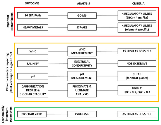 Combining all described biochar characteristics, a selection procedure can be designed to determine which biomass is optimal for biochar production as an amendment in green roof substrates. In Figure 5, on top, the most important biochar contaminants are listed together with the appropriate analysis method. Both PAHs and heavy metals have to meet regulatory limits if the biochar is to be applied in green roof substrates. The middle section shows additional important biochar characteristics that impact plant coverage on a green roof, including WHC, salinity, pH, carbonization degree, and biochar stability [15,16]. In this section, the only regulated characteristic is the carbonization degree. According to the EBC, O/C has to be below 0.4 and H/C has to be below 0.7 [43]. The limits for all other parameters are more arbitrary and plant-specific, but it is clear that a high WHC and a moderate salinity, pH, and biochar stability are desired in green roof substrates. The bottom section shows parameters that are important to consider for economic reasons, such as biochar yield. If followed from top to bottom, this sequence of analyses allows for the effective use of a certain biochar in green roof substrates.