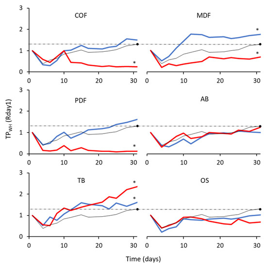 Surface coverage of Sedum hispanicum plants on green roof substrates with different biochars (T = 450 °C) in different application ratios (1 wt.% = blue, 5 wt.% = red, control = black, and endpoint of control = dashed black) over a period of 30 days. An asterisk (*) indicates a statistically significant difference from the control (p < 0.05). COF = coffee husks, MDF = medium-density fiberboard, PDF = palm date fronds, AB = AB wood waste, TB = tree bark, and OS = olive stones.