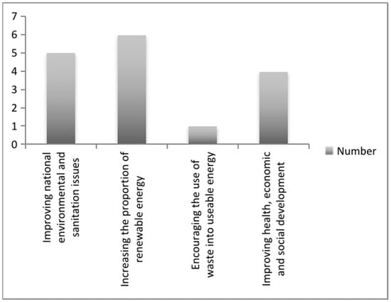Figure 2 depicts the frequency at which the policies reviewed captured each of the stated purposes. The policies are mainly set to improve sanitation and increase the renewable energy mix. Apart from the Ghana National Energy Policy (2010) [] that explicitly captures the conversion of waste to energy, policies that encourage the use of waste to produce usable energy were limited.