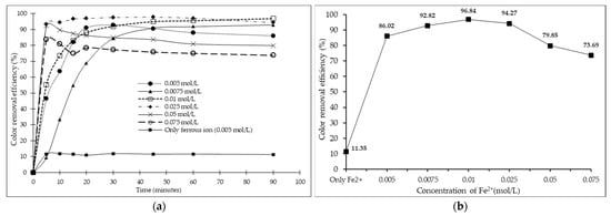 Effect of initial Fe2+ concentration on decolorization of melanoidin wastewater (initial melanoidin = 10,000 mg/L, H2O2 = 0.375 mol/L, pH = 3, reaction time = 90 min). (a) Color removal efficiency vs. reaction time where ● is Fe2+ = 0.005 mol/L, ▲ is Fe2+ = 0.0075 mol/L, □ is Fe2+ = 0.01 mol/L, ♦ is Fe2+ = 0.025 mol/L, ✕ is Fe2+ = 0.05 mol/L, ○ is Fe2+ = 0.075 mol/L, and ⯀ is only Fe2+ (0.005 mol/L). (b) Color removal efficiency vs. initial Fe2+ dosage at 90 min.