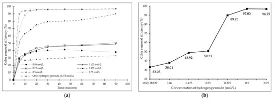 The effect of the H2O2 concentration (in the range 0.060–0.750 mol/L) on the decolorization of melanoidin was studied using a concentration of ferrous of 0.05 mol/L at pH 3 (Figure 3). It was found that the decolorization capacity increased with an increase in the H2O2 concentration, indicating that more available H2O2 initiated the generation of 🞄OH. The color removal efficiency was greater than 80% with a concentration of H2O2 at 0.375, 0.500, or 0.750 mol/L. The hydrogen peroxide reaction with ferrous could produce more 🞄OH radicals (Equation (6)). However, an increase in H2O2 necessarily affects the cost of color removal [29]. Thus, an H2O2 concentration of 0.375 mol/L was chosen for the following study.