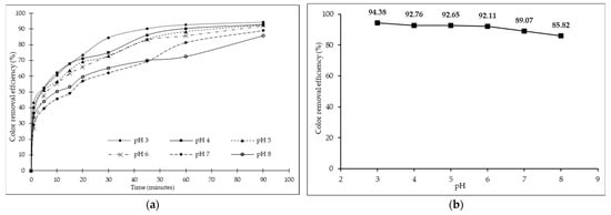 Effect of solution pH on decolorization of melanoidin wastewater (initial melanoidin = 10,000 mg/L, H2O2 = 0.375 mol/L, Fe2+ = 0.01 mol/L, reaction time = 90 min). (a) Color removal efficiency vs. reaction time where ● is pH 3, ⯀ is pH 4, ▲ is pH 5, ✕ is pH 6, ♦ is pH 7, and ○ is pH 8. (b) Color removal efficiency vs. initial pH at 90 min.