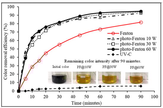 The decolorization of melanoidin was studied using a photo–Fenton process with a 253.7 nm UV–C lamp (Figure 6). These experimental conditions were selected based on former optimization experiments carried out with melanoidin wastewater. The effect of UV–C for the photo–Fenton (Fe2+/H2O2/UV) process was assessed using UV–C light power at 0 W, 10 W, 30 W, or 60 W for 90 min of irradiation. It was found that the UV–C power enhanced the decolorization rate of melanoidin wastewater. Adding UV–C light intensity up to 60 W for the photo–Fenton process increased the decolorization from 5467.99 ADMI to 285.53 ADMI (95.32%) (Figure 6). The decolorization in the Fe2+/H2O2/UV process was due to the generation of the hydroxyl radical by (i) a Fenton reaction (Equation (6)), (ii) the direct photolysis of H2O2 (Equation (1)), and (iii) the photoreduction of the Fe3+ formed during the irradiation (Equation (2)) [3,35].